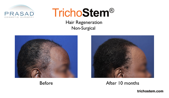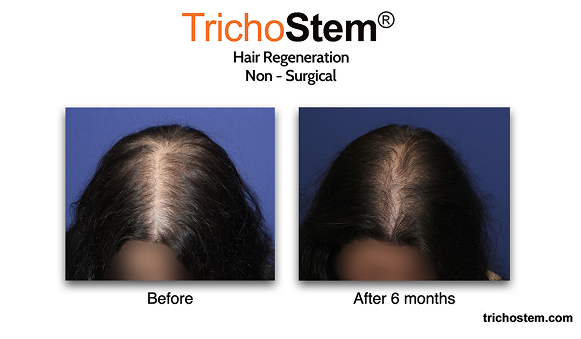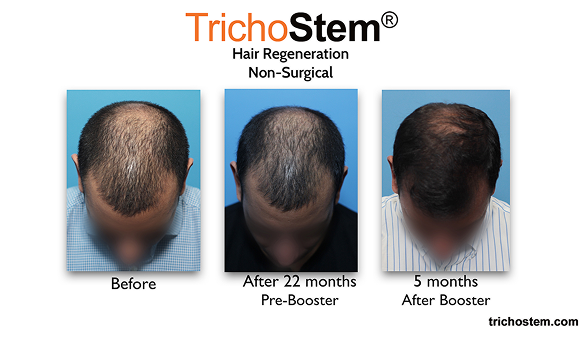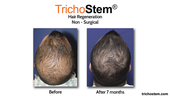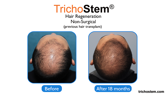 Native thinning hair, and even FUE transplant hair prone to thinning can be thickened by TrichoStem® Hair Regeneration, greatly improving scalp coverage even after multiple hair transplants.