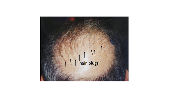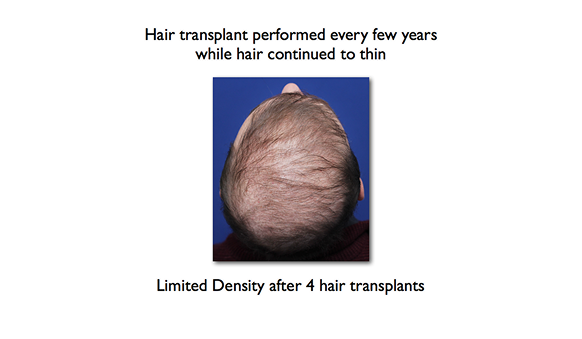 Visible “hair plugs” indicate why hair transplants are not permanent. Even with grafts genetically resistant to hair thinning, the surrounding native hair continues to thin, and are eventually lost, leaving only visible plugs of hair.